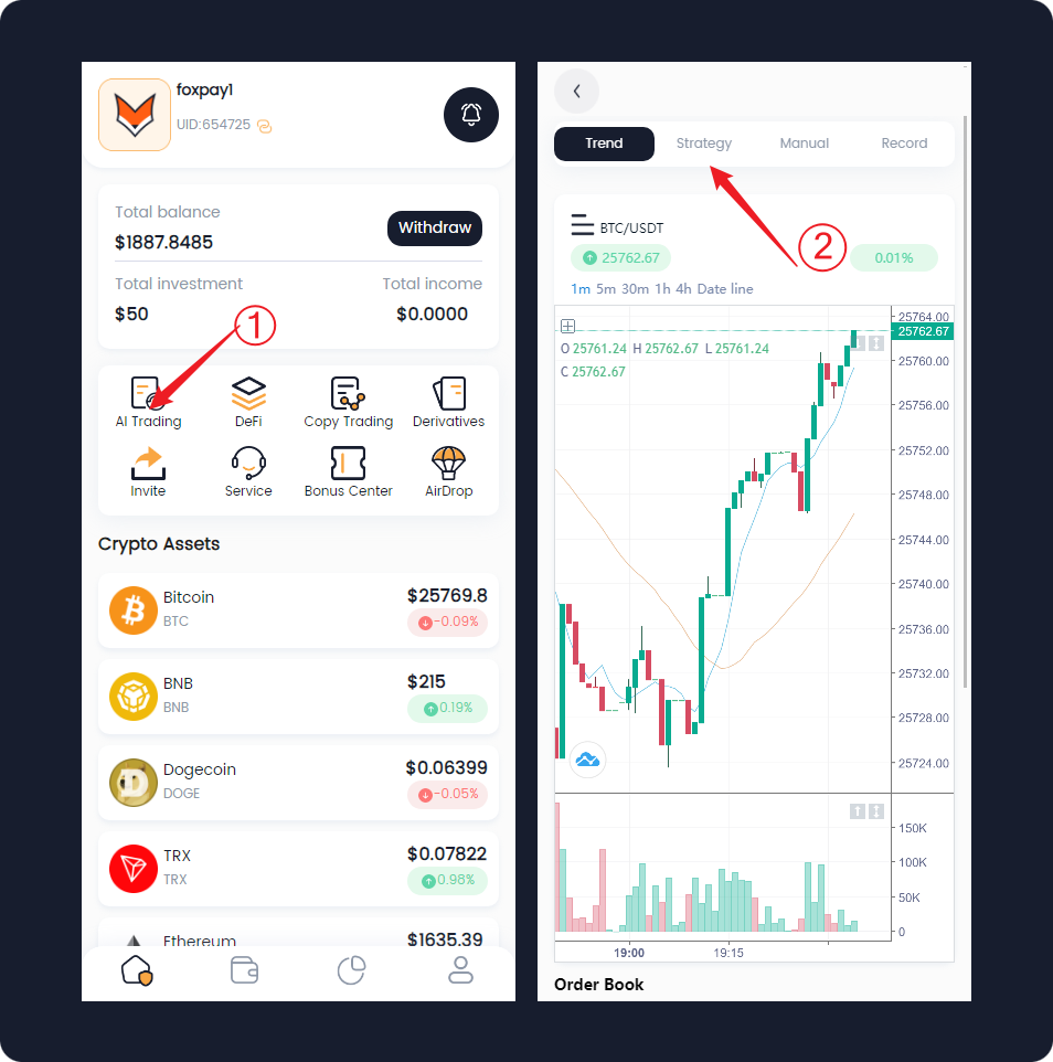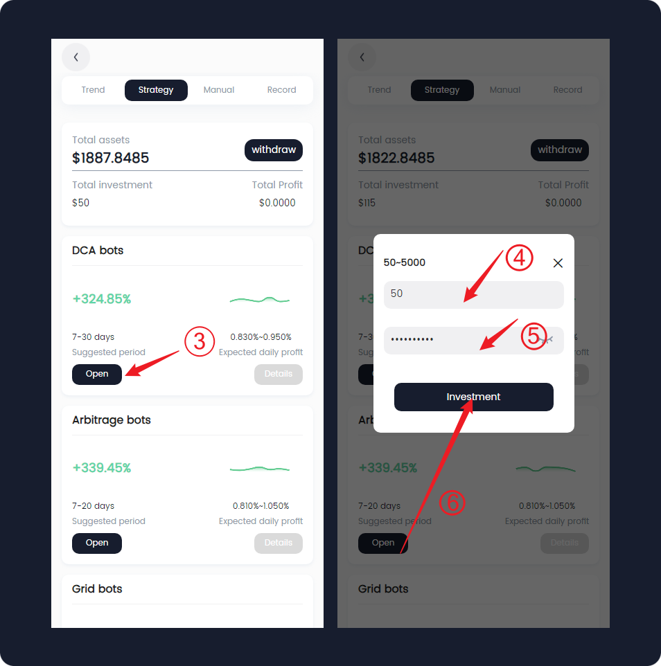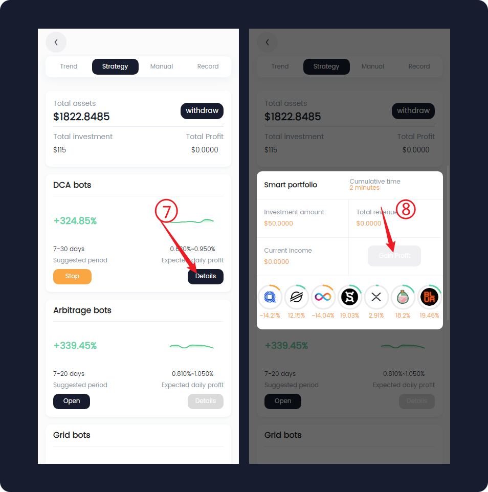 - 8. After one hour you can manually click to get the earnings. Each hour will generate a gain, you can collect it. Or you can click to get it at once when you end this investment.